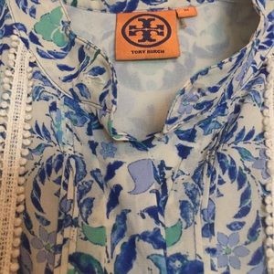 Beautifully printed Tory Burch blouse. Has 5 buttons up the front. Missing top button but I always wore a few buttons unbuttoned so I never noticed I was missing one!