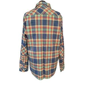 EVOLUTION ~ Women's button up plaid shirt. Plus-size 3XL. Collared shirt with long sleeves and button cuffs. Front patch pockets with flaps. Elbow patches. Long sleeves with buttons and straps for rolling them high. Blue, red, green, and tan plaid.