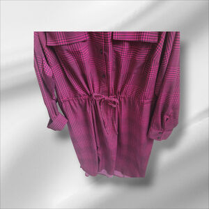 The EVRI Houndstooth Purple Black Drawstring Dress in size 3X is a versatile and stylish addition to any woman's wardrobe. This knee-length shirt dress features a flattering V-neckline, long sleeves, and a drawstring closure for a comfortable fit. The houndstooth pattern and button accents add a touch of sophistication, while the drop waist and pockets offer practicality. Made from machine-washable polyester, this dress is suitable for various occasions from casual outings to workwear or even a party or cocktail event, making it a colorful and stylish choice for the winter and fall seasons.