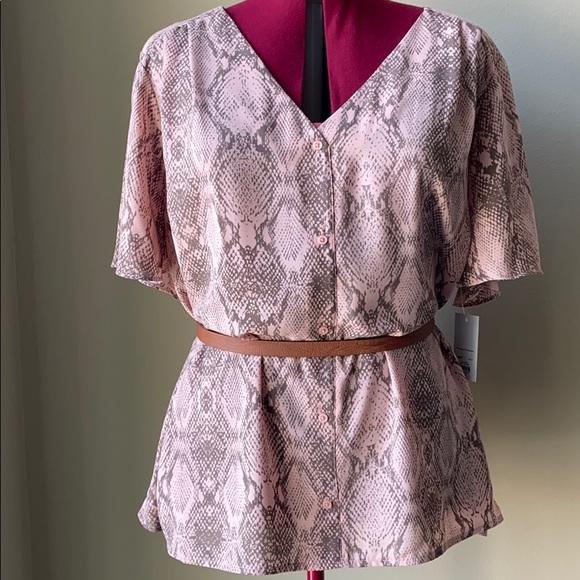 Pale Pink with brown pattern , button up top, no stretch. V-Neck and Lightweight. Belt not included.