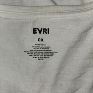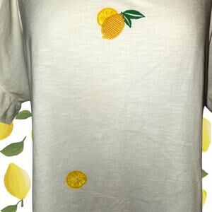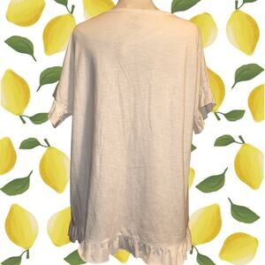 Up for grabs is a charming and pre-owned EVRI women's t-shirt in size 0X. This white tee features a delightful lemon print and has cute ruffle details on the sleeves and hem. It's perfect for summer or adding a touch of sunshine to your wardrobe. This t-shirt is made from a soft and comfortable fabric blend, making it great for casual wear.