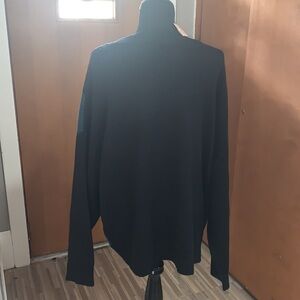 All black on the back. Drop shoulder sleeves, rib knit trim along hem, neck and bottom of sleeves. Sparkling lurex detail in the teal. Plus size 3x.