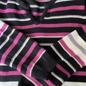 A stylish sweater featuring a distinctive pattern of black and pink horizontal stripes in a V-neck style.