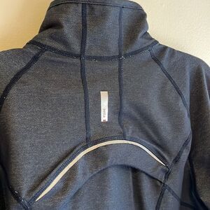 Beautiful denim blue reflective full-zip Zella jacket. Size medium. Back ventilation. Two front zip pockets. Pit to pit measurement is approximately 19”. Excellent condition with no flaws.