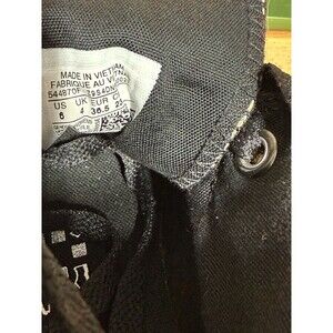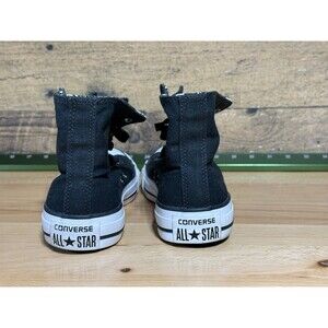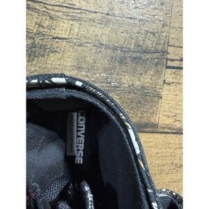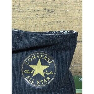 The Converse High Top 2 Fold Down LV Leopard Pattern in size 6 features a stylish design with a black and gold color scheme. This lace-up sneaker is made of canvas with rubber outsole, suitable for casual occasions in any season. The adjustable features and high top style make it perfect for walking and school activities. The LV Y2k theme adds a trendy touch to this classic Converse Chuck Taylor All Star model, offering a comfortable fit for women looking for a fashionable athletic shoe.