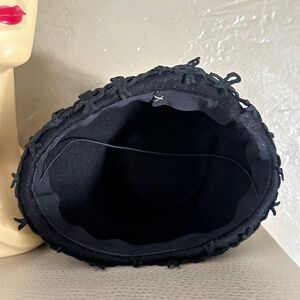This is an exception ally rare and glamorous black feet hat from the 1940s' which will enhance any outfit. The conical shape has a special shape as shown in the photos. The hat is also folded at the back to hold a beautiful Fred feather & quill. The bottom of the hat is trimmed with a beautiful black appliqué band. there is no size because the hat is to sit on top off the heat, tilted to one side. There is an elastic band attached th=o the inside of the hat to keep it in place.