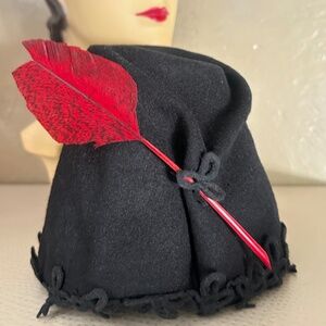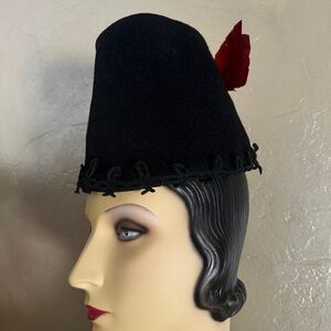 EXCEPTIONAL 1940s' UNIQUE TOP BLACK FELT CONICAL HAT + RED FEATHER & APPLIQUES