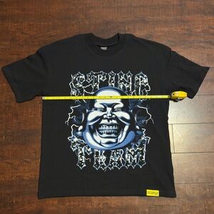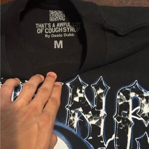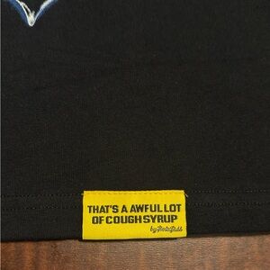 cough syrup, graphic tee, black cotton, streetwear, bold print, collectible, urban style, artistic design, statement piece, limited edition