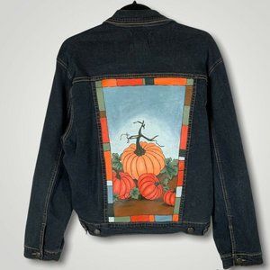 EXIT LA Denim Trucker Jacket Hand Painted Pumpkins Orange Autumn 1XL