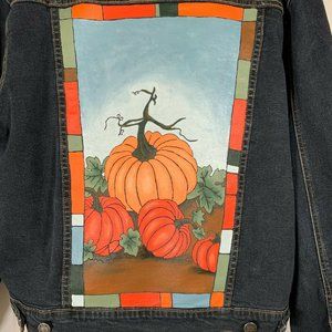 The hand-painted pumpkins feature various shades of orange, accented with greens for leaves and vines, creating a vibrant harvest scene across the back of the jacket. The paintwork is sealed for durability, ensuring your autumn statement piece lasts for seasons to come.