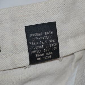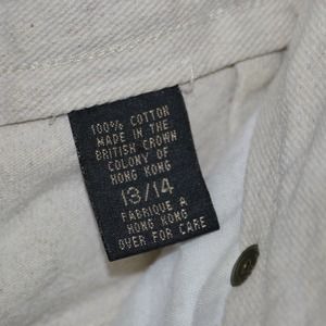 100% Cotton, Made in Hong Kong, Rigid Denim, Carrot, Zip Closure with Button at Top, Front & Back Pockets, Belt Loops
