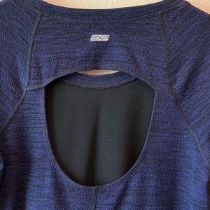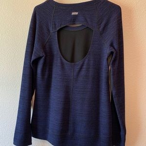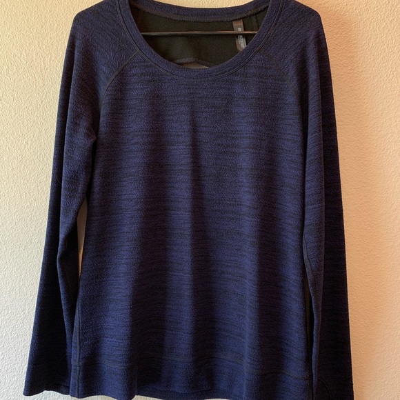 Extremely comfortable performance top with cool cutout on the back. Thumb holes in sleeves. Only worn a couple times.