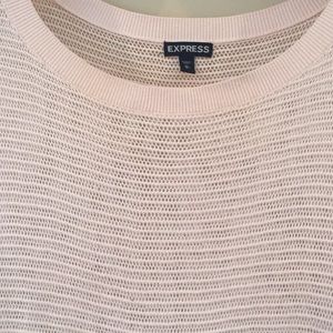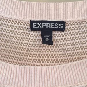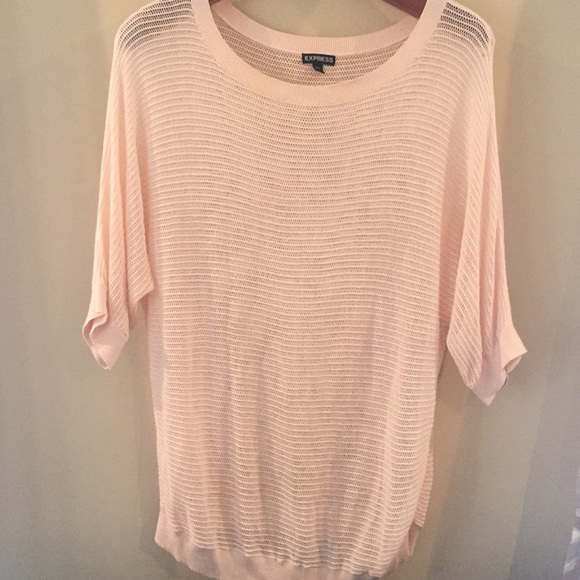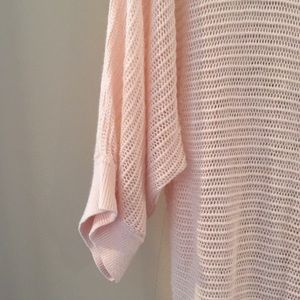 It’s hard to capture the color but this lightweight sweater is such a pretty peach color and perfect for spring! It is see through. In good condition!
