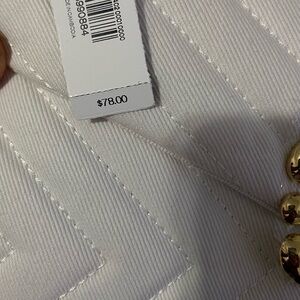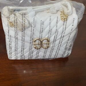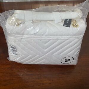 white crossbody bag features a chic chevron quilting pattern and a luxurious gold-toned chain strap. Its medium size
