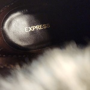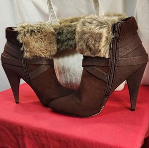 EXPRESS Dark Chocolate Brown combination Vegan Suede and leather ankle boot with Faux fur front. Crossbody straps and full side zip entry.
