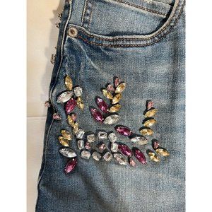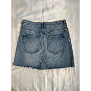 EXPRESS Bedazzled Gemstone Jean Mini Skirt Distressed Raw Hem Medium Light Sz 4