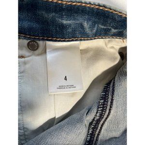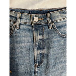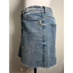 EXPRESS Bedazzled Embellished Rhinestone Gemstone Jean Mini Skirt Distressed Raw Hem Medium Light Wash Sz 4