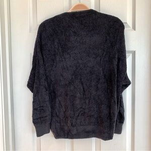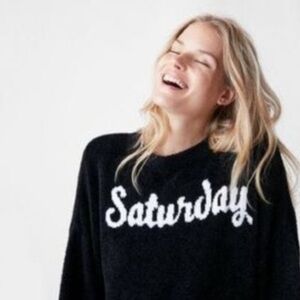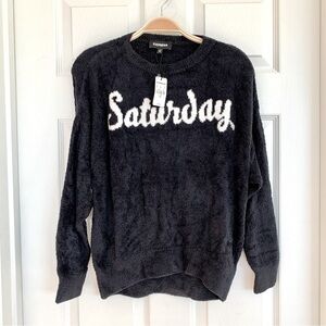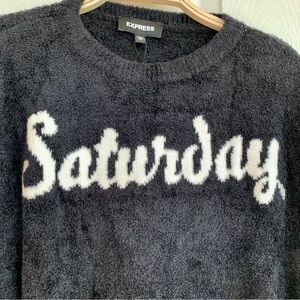 EXPRESS Black Fuzzy Saturday Script Graphic Teddy Sweater