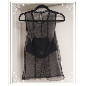 EXPRESS Black Ruffled Neck See Through Lace Sleeveless Top w/Built in Bra Sz L