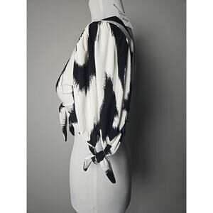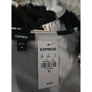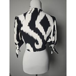 The EXPRESS Black & White Tie-Front Cropped Jersey Sweater Top in size XS is a stylish and versatile piece perfect for travel or casual occasions. This geometric patterned top features a V-neckline and short sleeves, made from a comfortable blend of 95% poly and 5% spandex. The black and white color scheme adds a trendy touch to this cropped sweater, which also has a regular fit and is machine washable for easy care. This top from Express is a great addition to any woman's wardrobe, suitable for winter, fall, or spring seasons. NWT $49.95