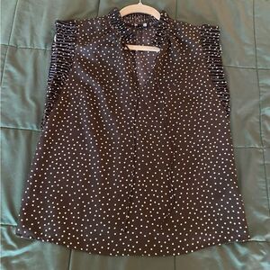 Chic Express sleeveless top featuring a classic black and white polka dot pattern. Perfect for any occasion. Great for work or date night or brunch with the girls! V-neck design with tie strings. Bold shoulder ruffle design. Great condition. Measurements in photos! Open to offers (: