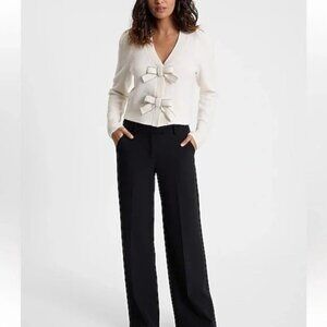 EXPRESS Bow V-Neck Puff Shoulder Cardigan Sweater in Ivory White