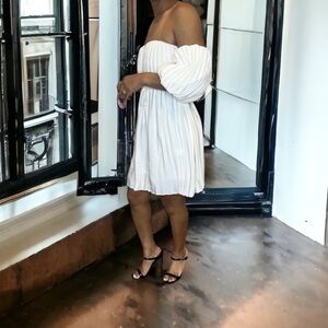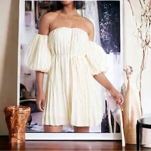 Express cream trapeze pleated dress belted cute puff sleeves — off shoulder style — the dress has silicone non slip band around sweetheart neckline, that has stretch feature — lined — could be worn without the tie belt as well — such an adorable dress & perfect for the new season!! Date Night out, wedding guest