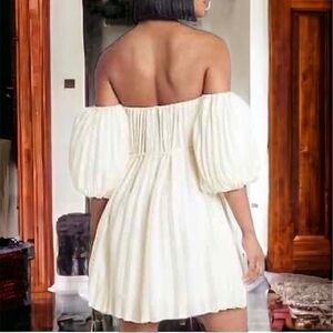 EXPRESS Cream Pleated Dress Belted Puff Off Shoulder Sleeves Sz S
