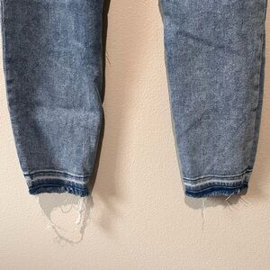EXPRESS- Curvy Skinny High Rise Women's Blue Distressed Jeans Size 8R. Stylish and comfortable blue distressed jeans perfect for casual outings. These jeans offer a trendy look with a touch of edginess.