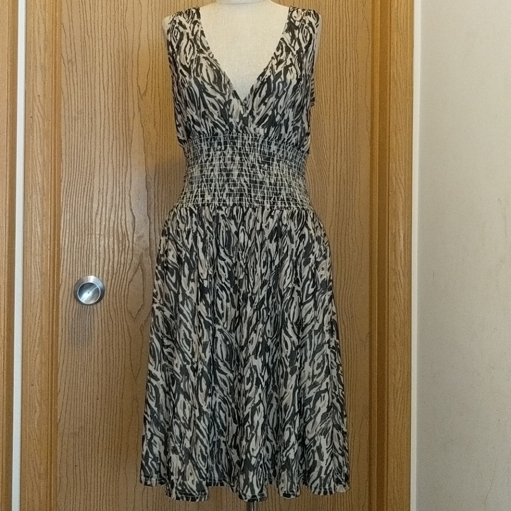 It's a stretchy camo-like dress with multiple colors, like tan, black, and a light brown. Pre-owned, Measurements: 28 inches : width (around the waist) 38 inches : length (top to bottom)