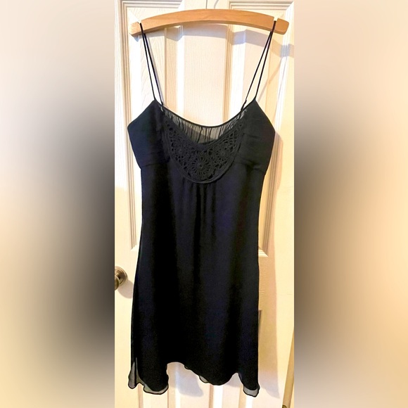 Black silk Express dress, size 4. Crochet-like smocking on bust. Loved, but in great condition and ready to party on!