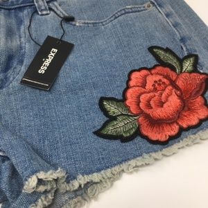 EXPRESS Factory faded distressed 5 pocket cutoff shortie shorts. Low rise. Frayed hem. Zip fly, button closure. Red rose applique patch. Available in sizes 4, 8, 10. See separate listings. Always ships within 24 hrs except on holidays and some Saturdays. Always hand-delivered to postal clerk for a receipt as proof of delivery.
