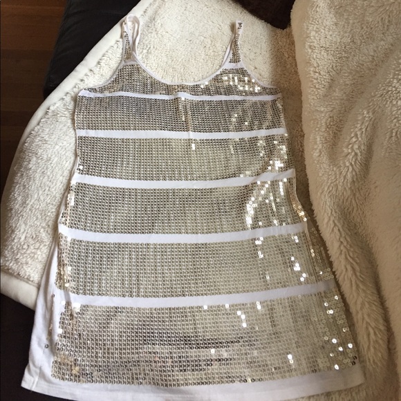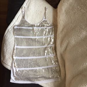 Gorgeous gold sequin Tunic top from Express! The Tank top is a cream color with layered gold sequin detail. Perry with leggings and pumps for a night out! Dress up with a blazer. Perfect for the holidays :) Worn once. Like brand new!