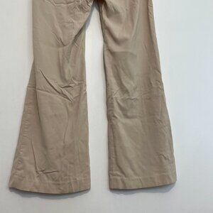 ◇ size 8 R / 8 regular length. Solid beige ish cream ish and/or khaki ish color. "Mid rise waist" (according to brand). Two hook & eye, single hidden button, and zipper zip fly. Two real front pockets, and one real back pocket with button closure. Approx wide leg and/or flare leg pants dress pant / trousers trouser (brand calls it a "wide leg", may be more of a flare leg - see measurements below)