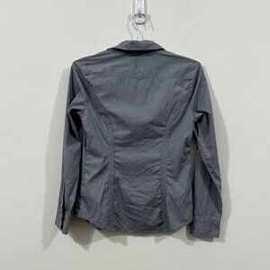This lot includes two EXPRESS The Essential Shirts in size XS/TP—one in turquoise blue and one in gray. These are tailored button-down shirts with princess seams, made from a cotton/polyester/spandex blend for stretch and structure. Each shirt features double button cuffs, ribbon detail around the inner collar, silver metal logo at the cuff, and seamed detailing throughout for a sleek, polished look.