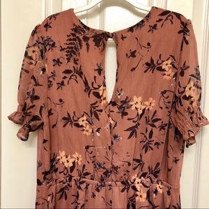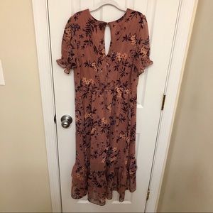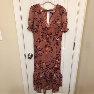 EXPRESS FLORAL PRINT RUFFLE MIDI DRESS in great condition! Wore it twice, once to a wedding. Looks great, feels great, easy to move in. Great length. Easy to wash and hang dry.