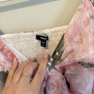 Embrace everyday elegance with the Express Floral Dot Sweetheart Neckline Thong Bodysuit. This stylish piece, sized medium, is designed to flatter with its unique sweetheart neckline and balloon sleeves, offering a chic and comfortable fit for any occasion. The delicate pink hue is adorned with a playful floral pattern, making it a delightful addition to your wardrobe. Crafted from smooth polyester material, the bodysuit ensures a regular fit that moves with you. It features a gathered back accent for a touch of sophistication and is sheer enough to add a hint of allure to your ensemble. Whether dressed up or down, this bodysuit from Express is a versatile choice that exudes a sense of casual chic.