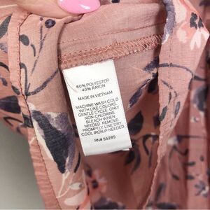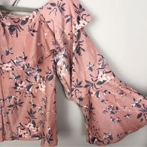 Gorgeous blush pink shirt by Express. Off the shoulder with v halter straps that are adjustable. Ruffle detail around the top. Flare bell sleeves. Purple/gray flowers. Great condition! Womens size extra small (XSmall, x-small).