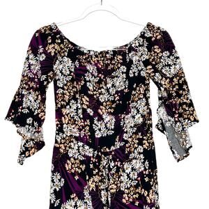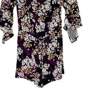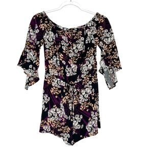 EXPRESS Floral Off-Shoulder Romper Flutter Sleeve Drawstring Black Purple Size S