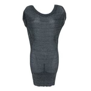 This express dress is a charcoal gray black with a woven metallic glitter trim it is fitted with short cap sleeves, a wide open boat neck. This would be a great layer or would work well as a swimsuit cover