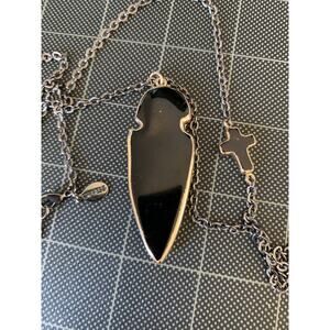 Unusual design with faux arrowhead and cross on same necklace. Pendants are edged in gold color and chain is gray metal.