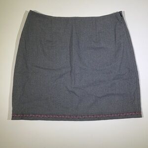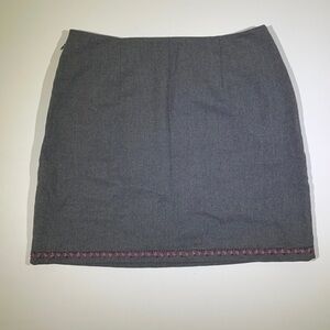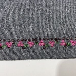 excellent condition size: 7/8 color: grey w/ pink flower border at hem materials: 63% polyester / 34% rayon / 3% spandex