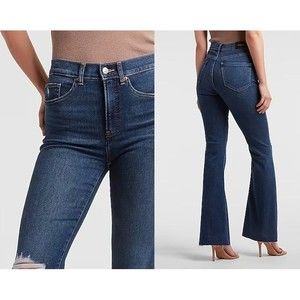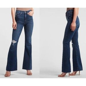 EXPRESS High Rise Flare Supersoft Ripped Knee Raw Hem Bell Bottom Stretch Jeans