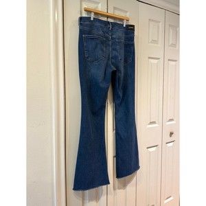 EXPRESS Supersoft High Rise Flare Jeans with raw hem in a distressed med-dark wash, size 14L.