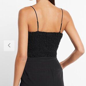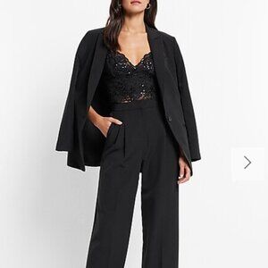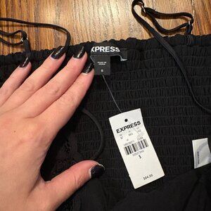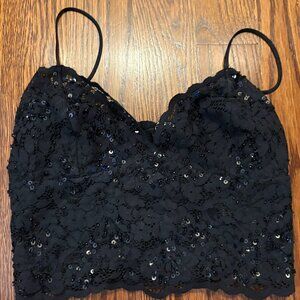 The product is a stylish black crop top bralette from Express, designed for women in size small. Made from a blend of mesh lace and cotton, this bra offers a comfortable fit with a touch of sparkly accents. The bralette style, wireless underwire, and spaghetti strap design make it a trendy and fashionable choice for everyday wear or special occasions. Perfect for adding a touch of glamour to any outfit, this bra is a versatile and chic addition to any wardrobe.