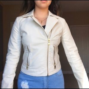 bone colored leather jacket with gold accents and pockets (model is 5’2 size s/m)