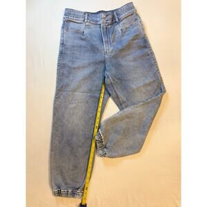 A light-wash super soft denim pair with a high-rise, elasticized waistband and a button and zipper closure. The legs are tapered and the cuffs are also elasticized, giving them a jogger-style silhouette. The jeans have front pockets, back pockets, and belt loops.
