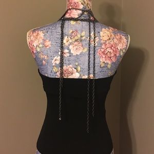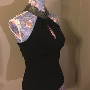 Express metal mesh halter top. Subtly sexy with black/ gunmetal mesh neckline and dangling chains in back. Built in bra panel for support. 93% polyester/ 7% spandex, size small. So unique!