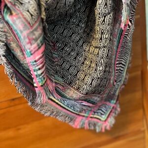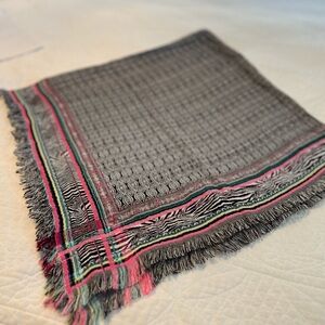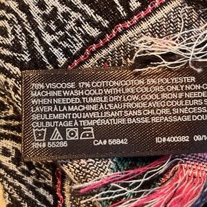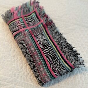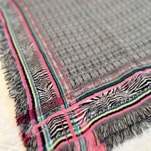 Stylish scarf with intricate patterns. Features black, pink, and green accents. Perfect for adding flair to any outfit.