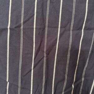 Stylish navy dress with white stripes. Features ruffle sleeves and a tie waist.